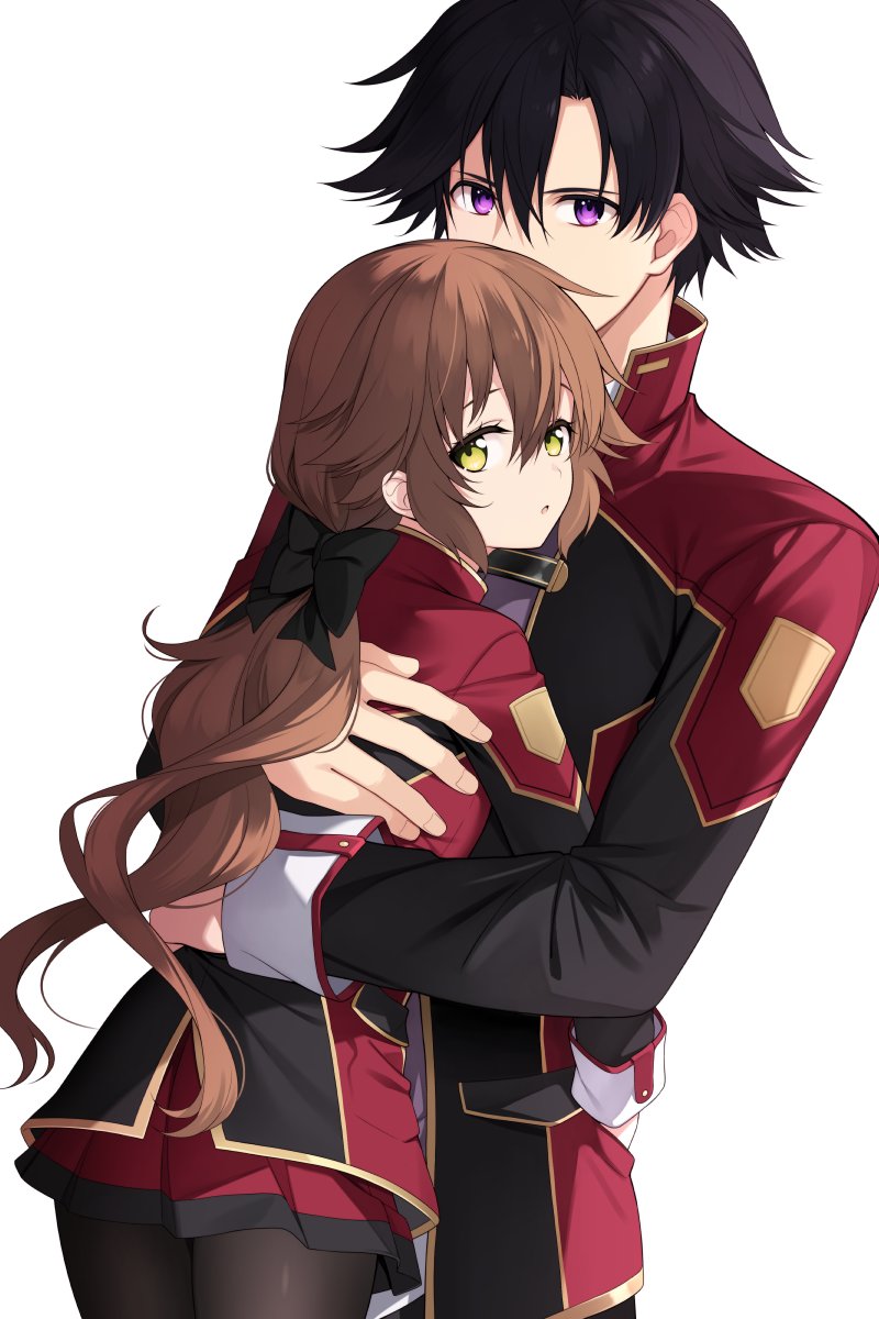 1boy1girlblack hairblack pantyhosebrown haircoatcouplegreen eyeshair between eyeshuglong hairlooking at viewerlow ponytailpantyhoseponytailpurple eyessimple backgroundthors military academy class vii uniform