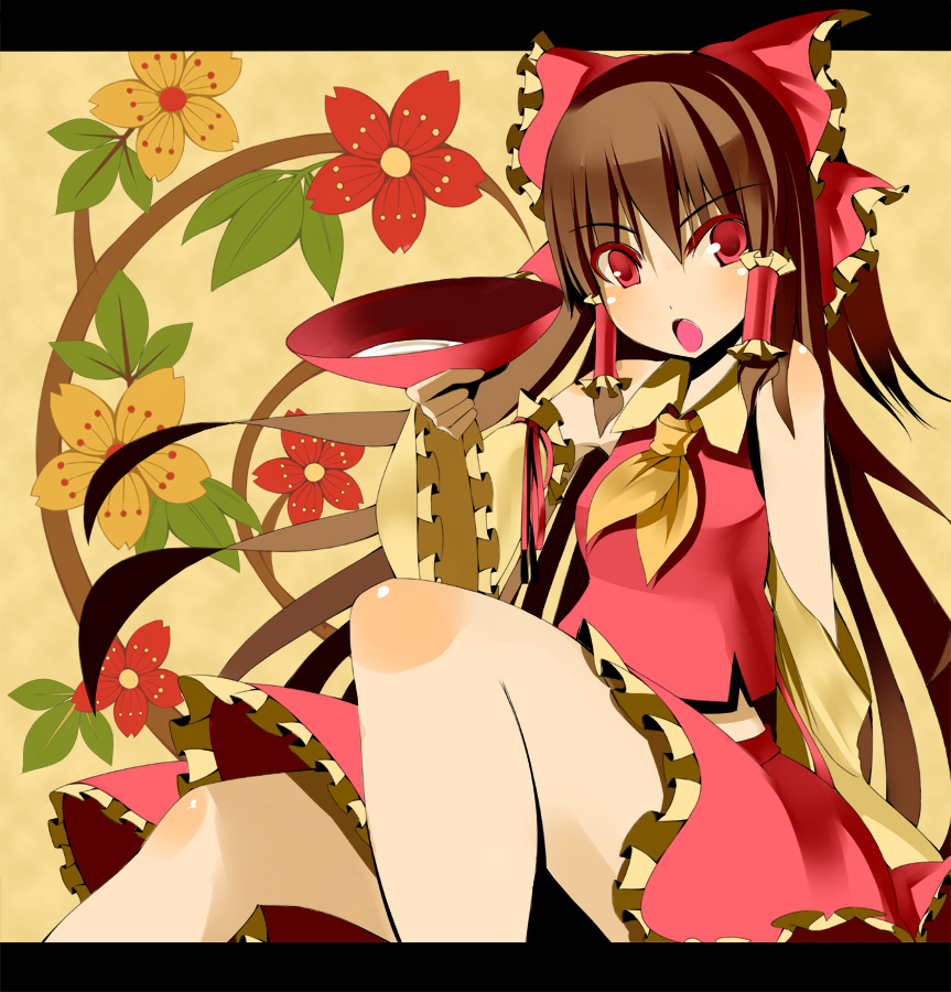 1girlalcoholbrown haircupdetached sleevesfemale focusjapanese clothesletterboxedlong hairmikoopen mouthred eyessakazukisakesolo