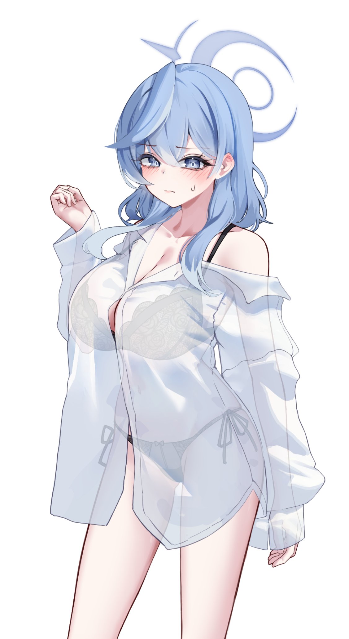 1girlblack brablack pantiesblue eyesblue hairblue haloblushborrowed clothesbrabreastscleavageclosed mouthcollarbonecowboy shothair between eyeshalohand uplarge breastslong hairlooking at viewerpantiessee-through clothessee-through shirtshirtshirt partially removedside-tie pantiessimple backgroundsmall sweatdropsolostandingunderwearwhite backgroundwhite shirt