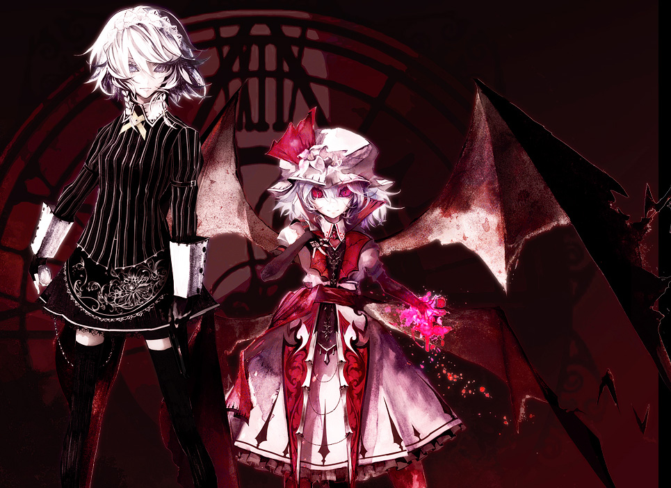 2girlsalternate costumebat wingsclockdarkdressfemale focusfingerless glovesfrillsgloveshatmaidmultiple girlspale skinpocket watchpurple eyespurple hairred eyesshort hairskirtsmilethighhighsvampirewatchwings