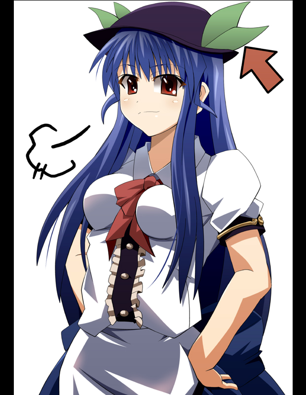 1girlarrow (symbol)blue hairbreast paddingfemale focushands on own hipshatletterboxedlong hairred eyessolowhite background