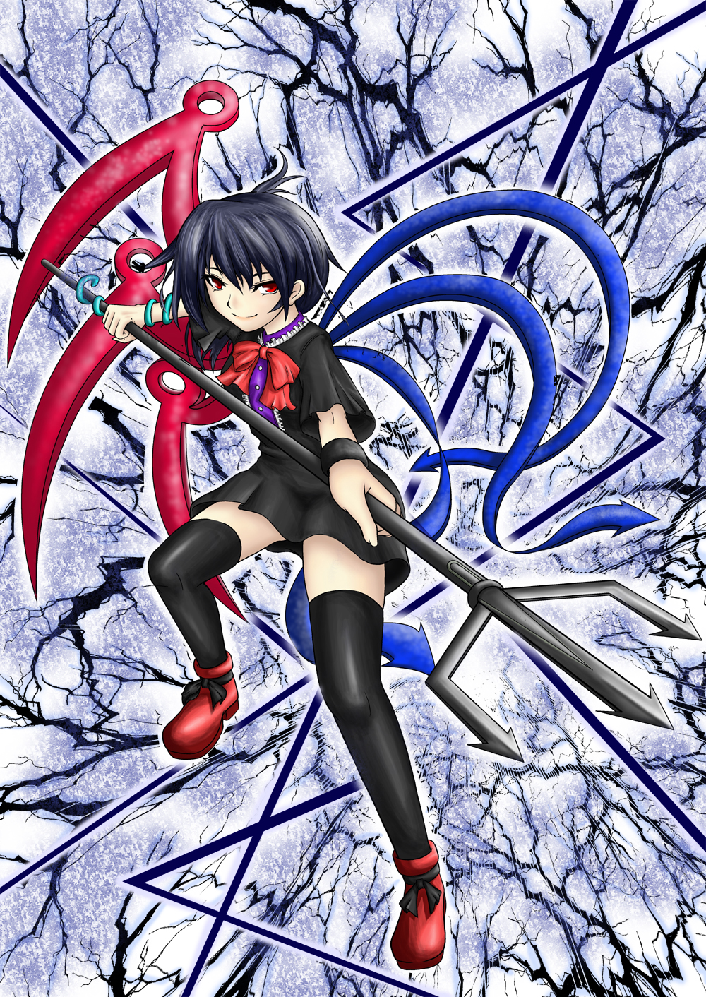 1girlblack hairblack thighhighsfemale focusfull bodypolearmred eyesshort hairsnakesolospearthighhighstridentweaponzettai ryouiki