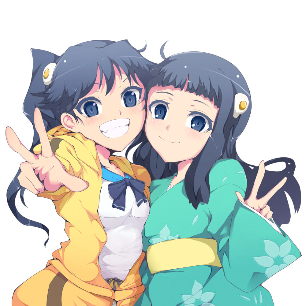 00s2girlsahogeasymmetrical hairblue eyesblue hairblushegg (food)foodfried egggrinhair ornamenthoodhooded track jacketjacketjapanese clotheskimonolong hairmultiple girlsponytailsiblingssisterssmiletrack jacketvyukata