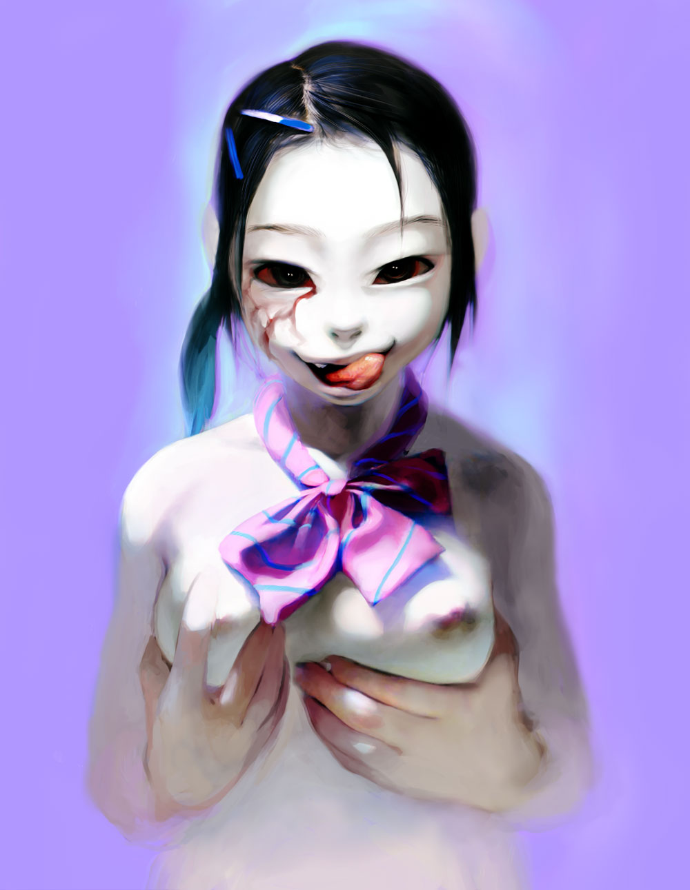 black hairbloodbreastsgrabbing another's breasthair ornamenthairpinlip lickinglipsmonster girlparanormalrealistictonguewhite skin