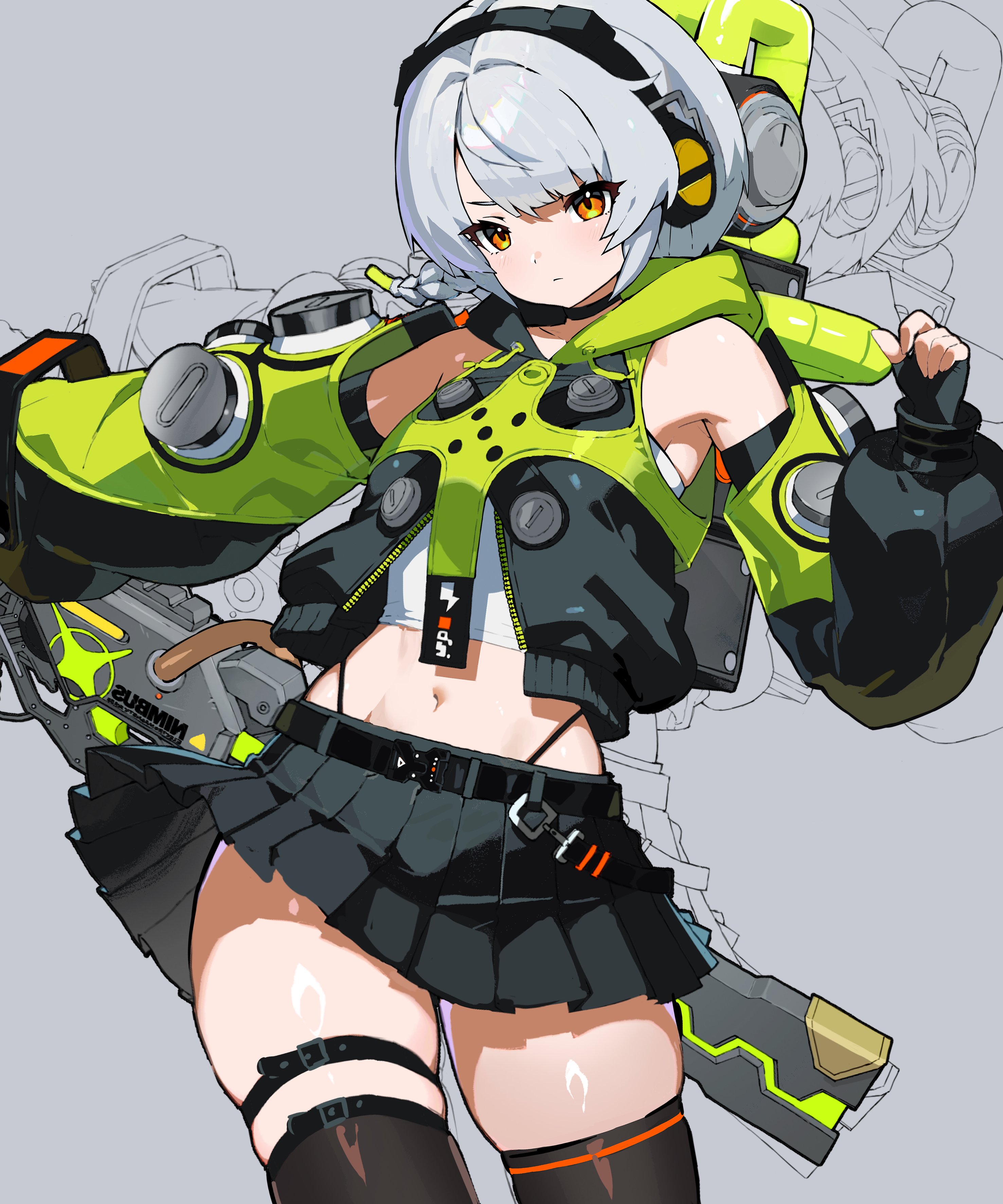 1girlbare shouldersbelted skirtblack glovesblack skirtblack thighhighsbraidbraided sidelockclosed mouthcowboy shotfingerless glovesglovesgreen jacketgreen sleevesgrey backgroundgrey hairheadphonesholdingholding behind backholding swordholding sword behind backholding weaponholding weapon behind backhoodhooded jacketjacketlooking at viewermidriffmulticolored sleevesnavelorange eyesshort hairskindentationskirtsleevelesssleeveless jacketsoloswordthigh strapthighhighsweapon