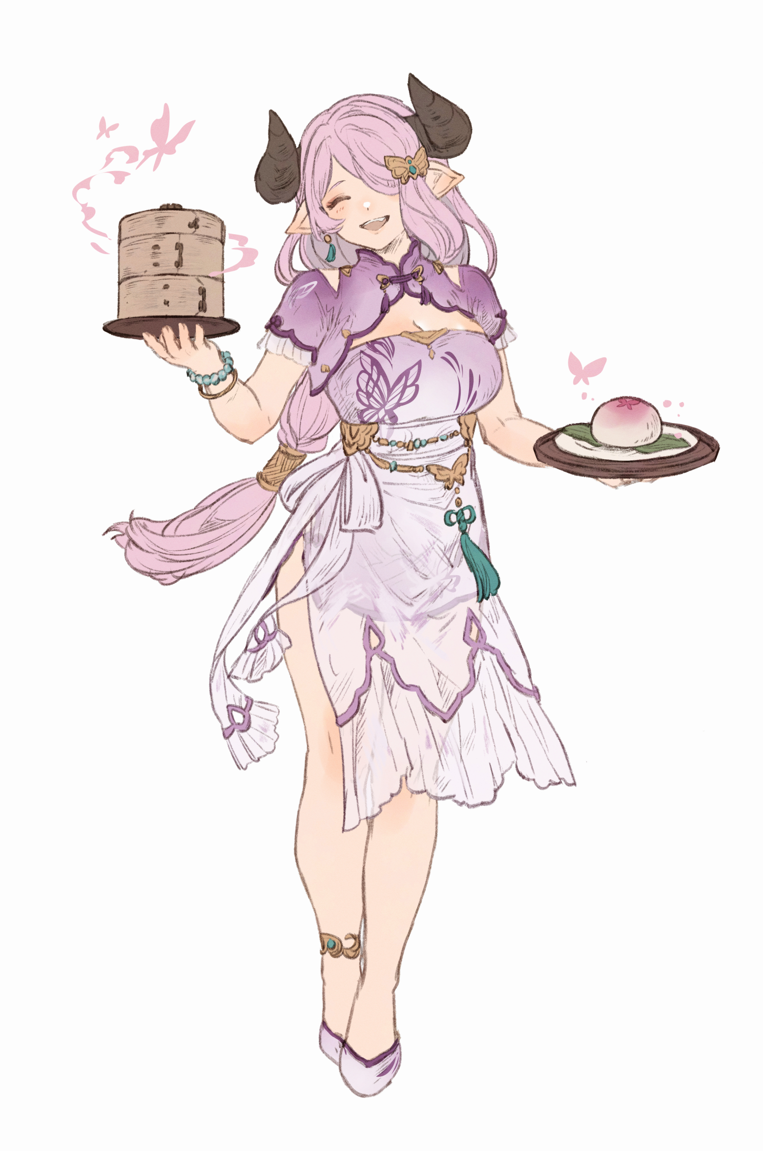 1boy1girlbamboo steamerbraceletbreastschina dresschinese clothescleavageclosed eyescurled hornsdressearringsfacing viewerfull bodyhair ornamenthornsjewelrylong hairlooking at viewerpointy earsside slitsimple backgroundsolotasselvery long hairwhite background