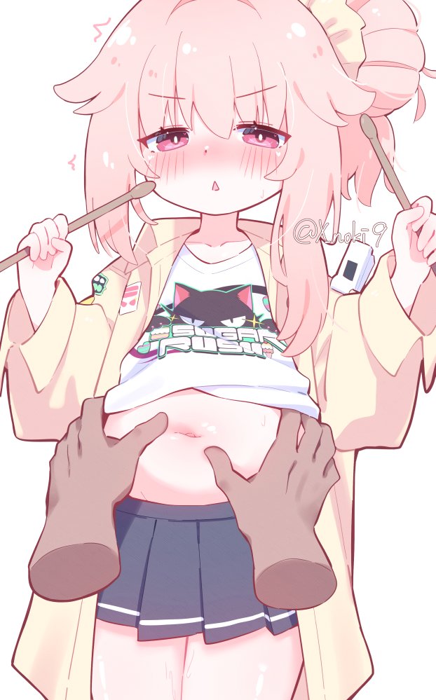 1girlahogebellybelly grabblushbright pupilsdisembodied handdrumsticksgrabbing another's stomachhair between eyeshair bunhair ornamenthair scrunchiehaloholdingholding bellyholding drumsticksjacketjitomelegs togetherlogo printlong hairlong sleeveslooking at viewermidriff peekminiskirtnavelnavel focusofficial alternate costumepink eyespink halopink pupilspleated skirtplumpscrunchieshirtsingle hair bunskirtsleeves past wristssolosolo focuswhite backgroundwristbandyellow jacketyellow scrunchie