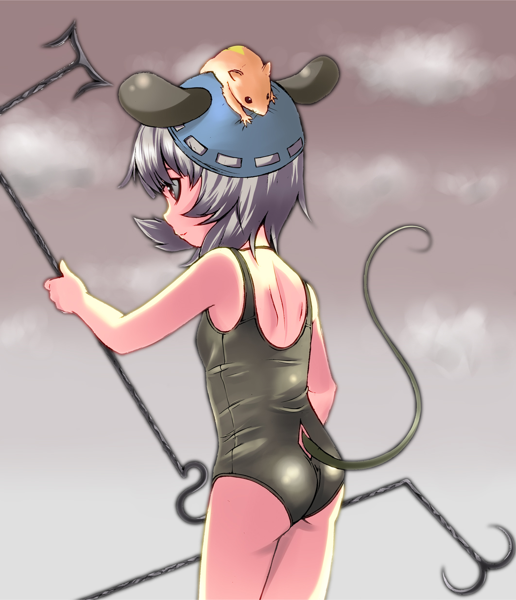 1girlanimal earsassbacklightingcloudfemale focusgrey hairmouse (animal)mouse earsmouse tailone-piece swimsuitred eyesschool swimsuitshort hairsoloswim capswimsuittail