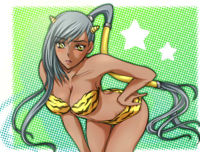 1girlanimal printbikinibreastscleavagecone hornscosplaydark skindark-skinned femalefemale focushornslarge breastslong hairlum (cosplay)onismall hornssoloswimsuittiger printyellow bikiniyellow eyes