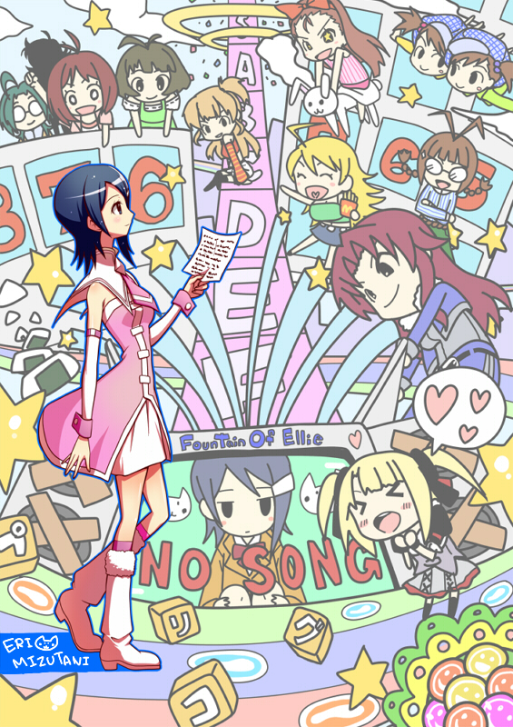 kamashi, hiiragi kagami, hiiragi tsukasa, iwasaki minami, izumi konata, kobayakawa yutaka, kusakabe misao, mega man (character), minegishi ayano, patricia martin, takara miyuki, tamura hiyori, yasaka kou, capcom, cheetahmen, kuso miso technique, lucky star, lyrical nanoha, mahou shoujo lyrical nanoha, mario (series), mega man (classic), mega man (series), metroid, nintendo, super mario bros. 1, tennis no ouji-sama, touhou, vocaloid, yu-gi-oh!, yu-gi-oh! duel monsters, 6+girls, ahoge, breasts, cosplay, everyone, female focus, mega man (character) (cosplay), mole, mole under eye, multiple girls, siblings, sisters, twins