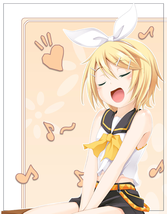 1girlblonde hairclosed eyesfemale focushair ornamenthair ribbonhairclipheartmidriffmusicmusical noteribbonshort hairshortssingingsmilesolo