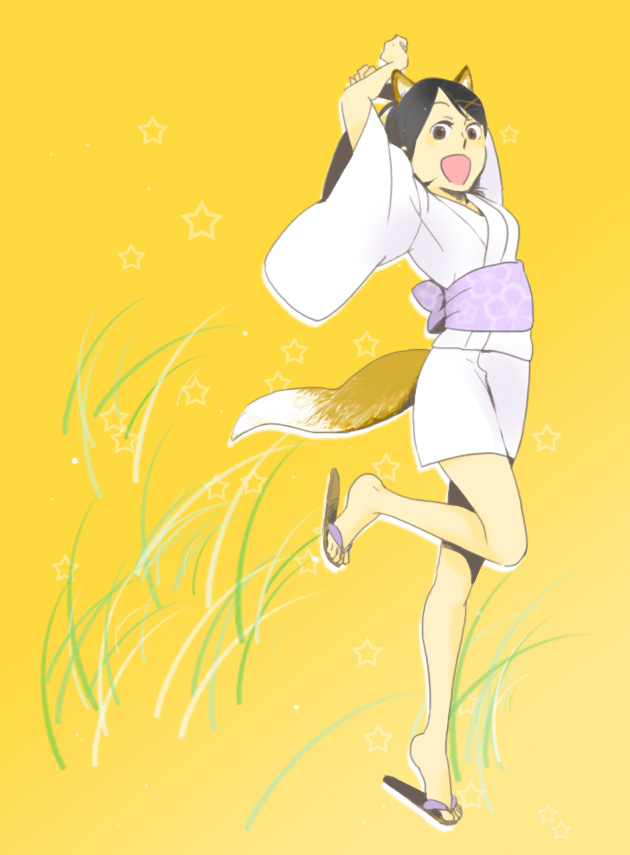 00s1girlanimal earsarms upblack hairbrown eyesfemale focusfox earsfox tailhair ornamenthairclipjapanese clotheskimonolegssandalsshort hairsmilesolotail