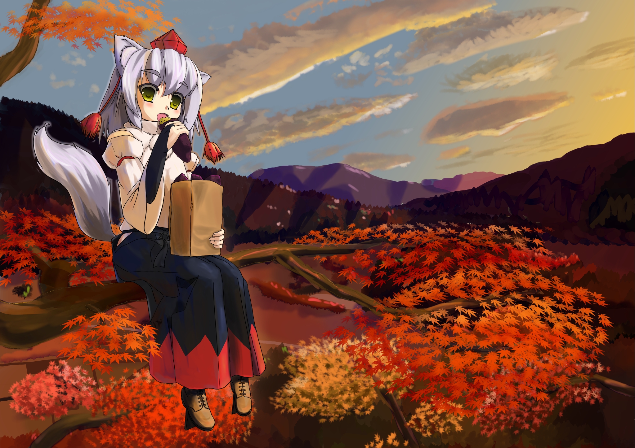 1girlanimal earsdetached sleeveseatingfemale focusfoodgetahatshort hairsolosweet potatotailtengu-getatokin hatwolf earswolf tail