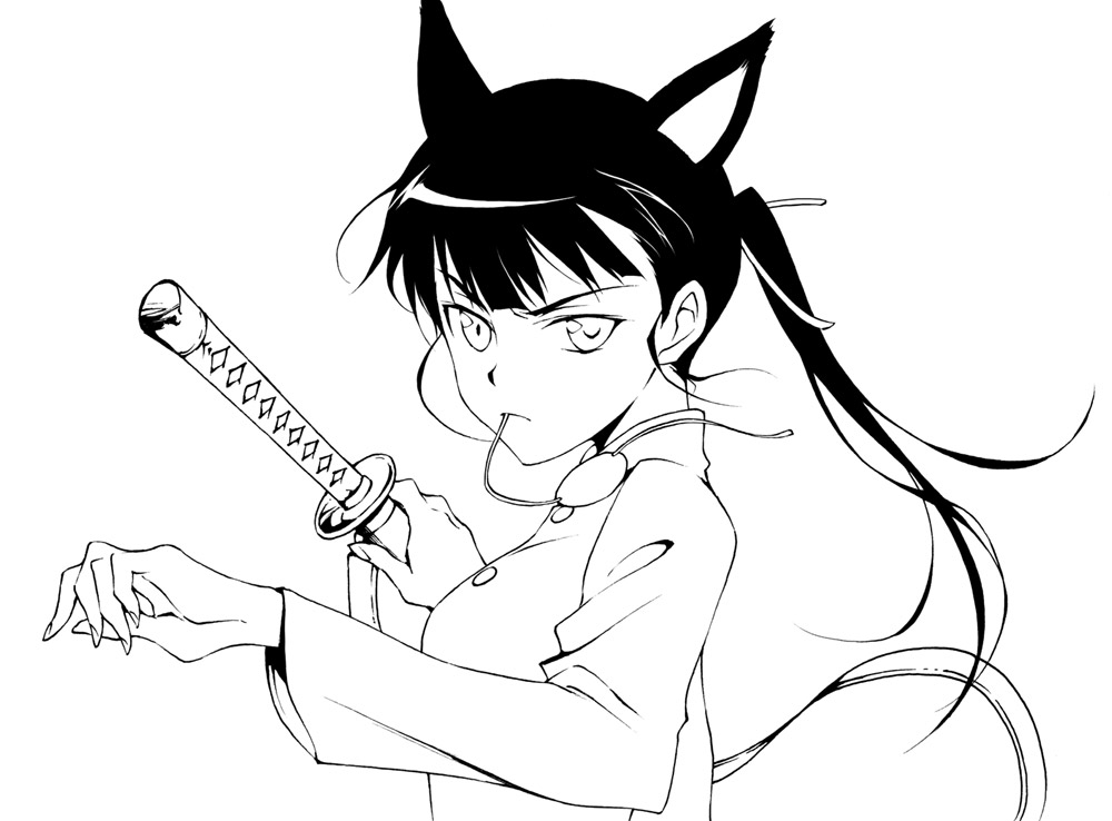 00s1girlanimal earsblack haireyepatchfemale focusgreyscalelong hairmonochromemouth holdponytailsoloswordweapon