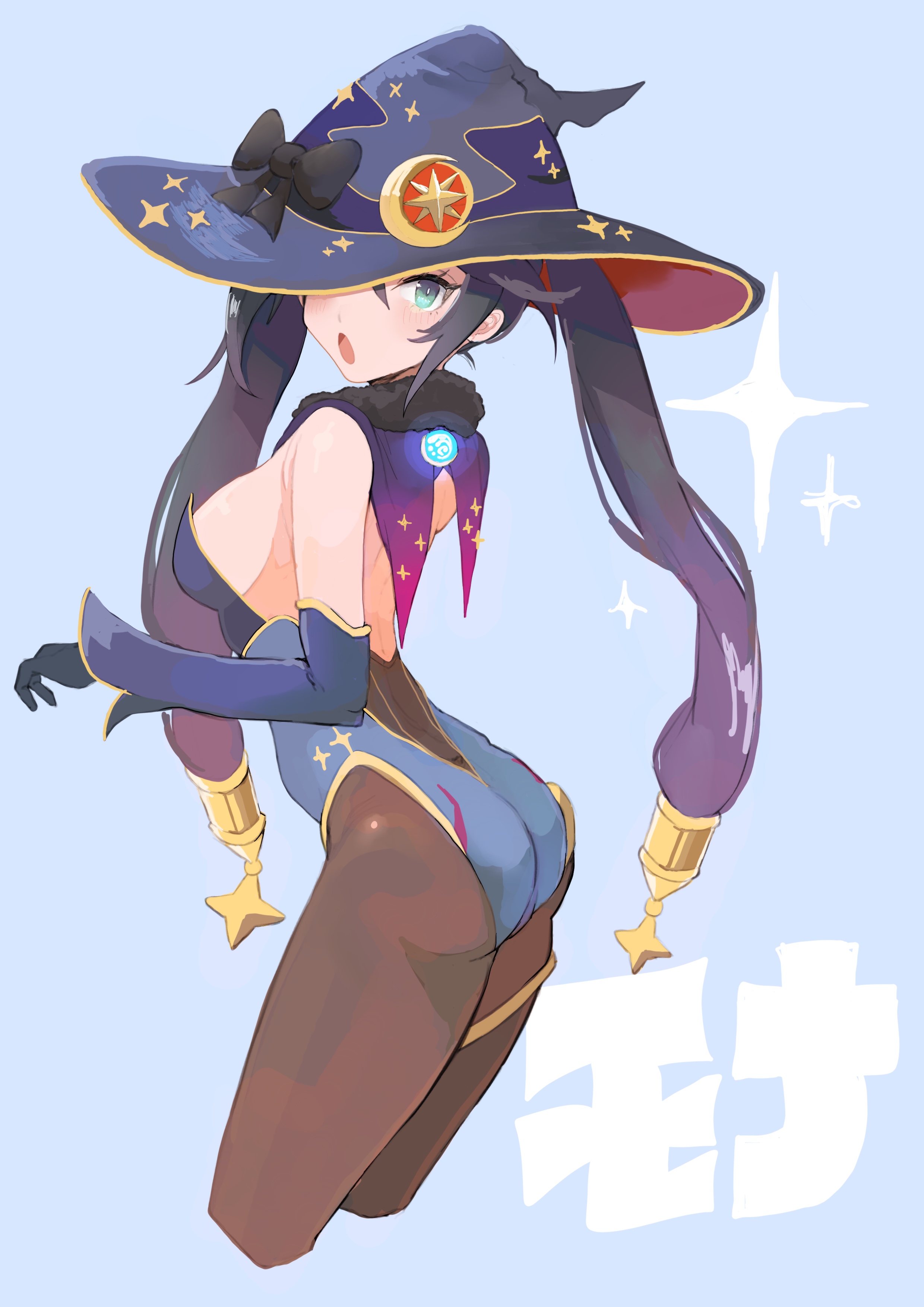 :d1girlblack bowblack glovesblack hairblue backgroundblue hatblue leotardblue sleevesblushbowbreastsbrown pantyhosecharacter namecropped legsdetached sleevesglovesgradient hairgreen eyeshathat bowlarge breastsleotardmulticolored hairopen mouthpantyhosepurple hairsideboobsketchsmilesolostraplessstrapless leotardtwintailswitch hat