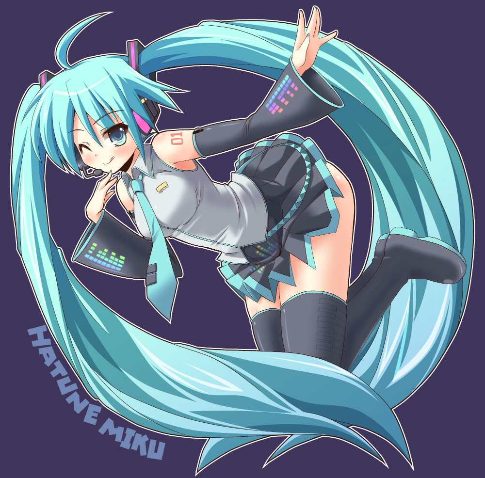 1girlaqua eyesaqua hairdetached sleevesfemale focuslong hairnecktieone eye closedskirtsolothighhighsthighstwintailsvery long hairwink