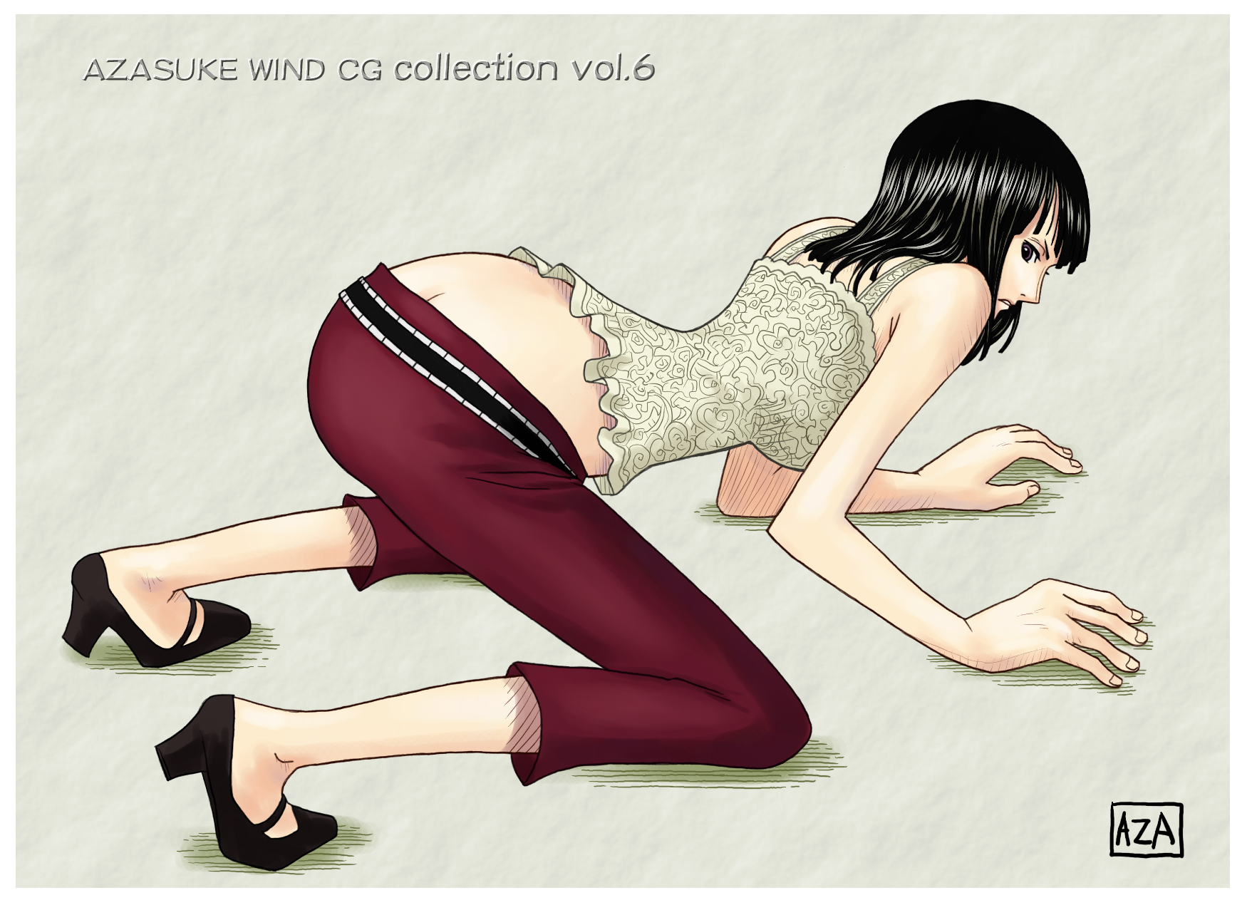 1girlall foursartist nameassblack hairblunt bangsborderbutt crackcamisolecapri pantsfemale focusfull bodygrey backgroundhigh heelsmedium hairpantspurple eyesshoessolowhite border