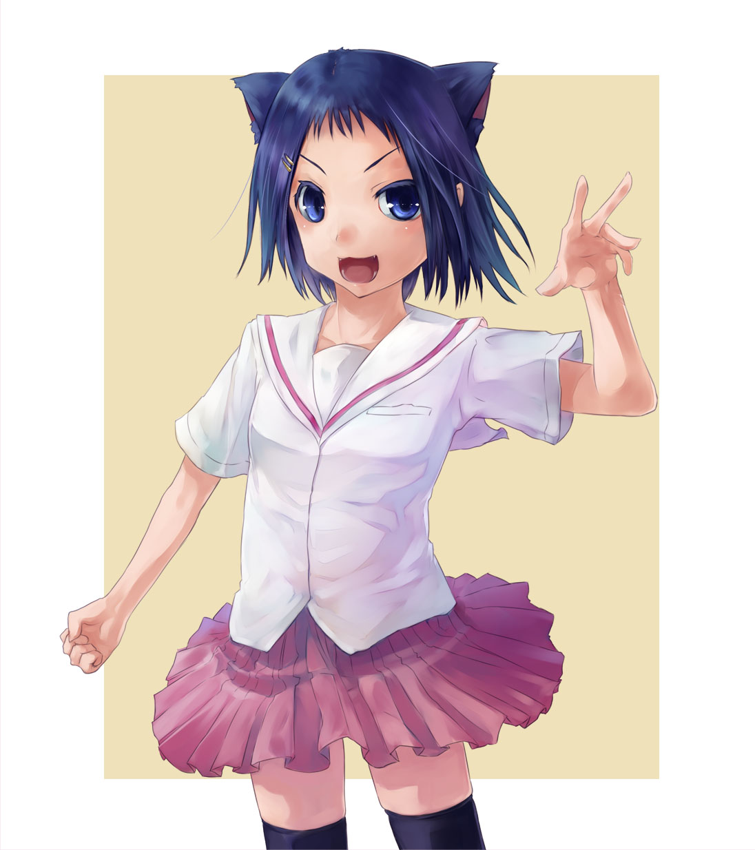 00s1girlanimal earsblue eyesblue haircat earsfangsfemale focusmatching hair/eyesschool uniformshort hairsolothighhighs