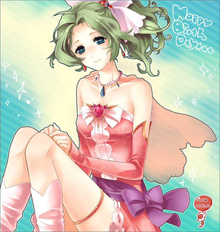 1990s (style)1girlblue eyesbootsbowcapeearringselbow glovesfemale focusglovesgreen hairjewelrylong hairnecklaceno legwearpink bootspink bowpink ribbonponytailretro artstyleribbonsashsittingskirtsmilesolo