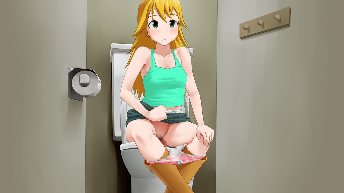 blonde hairblushfemaleFlag for Deletiongreen eyeslong hairpantiespanty pullpeeingpubic hairpussysittingskirt liftspread legstoilettoilet useunderwear