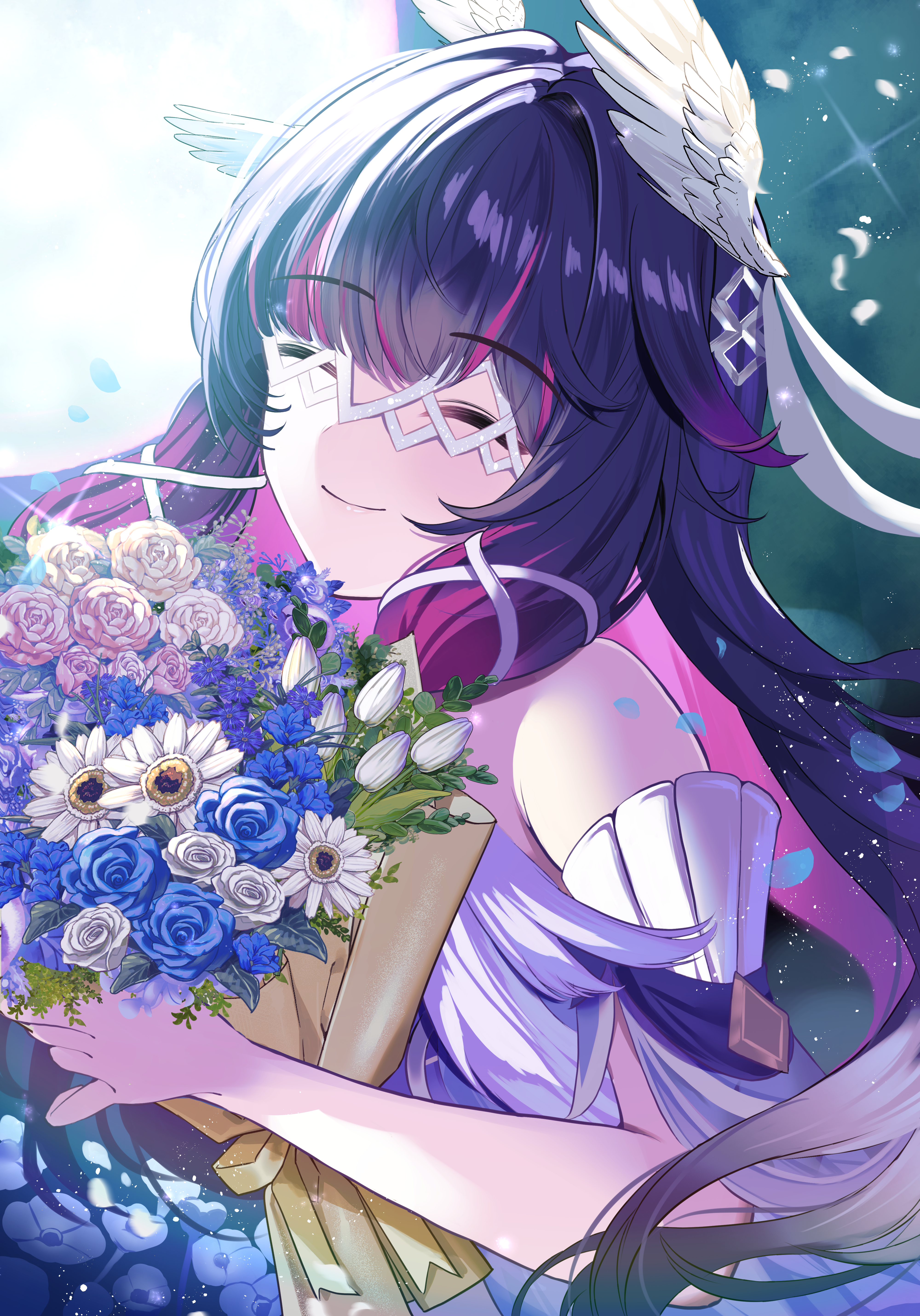 1boy1girlbare shouldersblue flowerblue rosebouquetclosed eyesclosed mouthdressfeathered wingsflowerhead wingsholdingholding bouquetlong hairmulticolored hairpink flowerpink hairpink rosepurple hairroseshort sleevessmilesolostreaked hairtuliptwo-tone hairupper bodywhite dresswhite flowerwhite tulipwhite wingswings