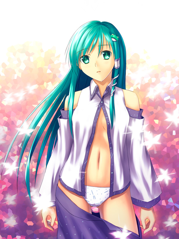 1girlfemale focusfroggreen eyesgreen hairhair ornamentjapanese clotheslong hairmatching hair/eyesmikopantiessnakesolounderwear