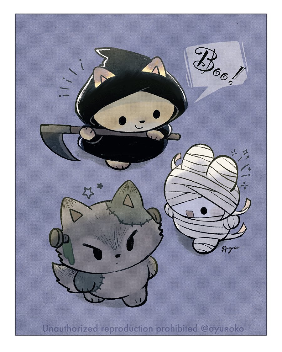 :danimalanimal focusbandagesborderclosed mouthcosplayfoxgrim reaper (cosplay)halloweenholdingholding scytheno humansobject through headopen mouthpatchwork skinpurple backgroundrabbitromaji commentaryscrew in headscythesignaturesmilesolid circle eyessparklestar (symbol)twitter usernamev-shaped eyeswatermarkwhite borderwolfzombie