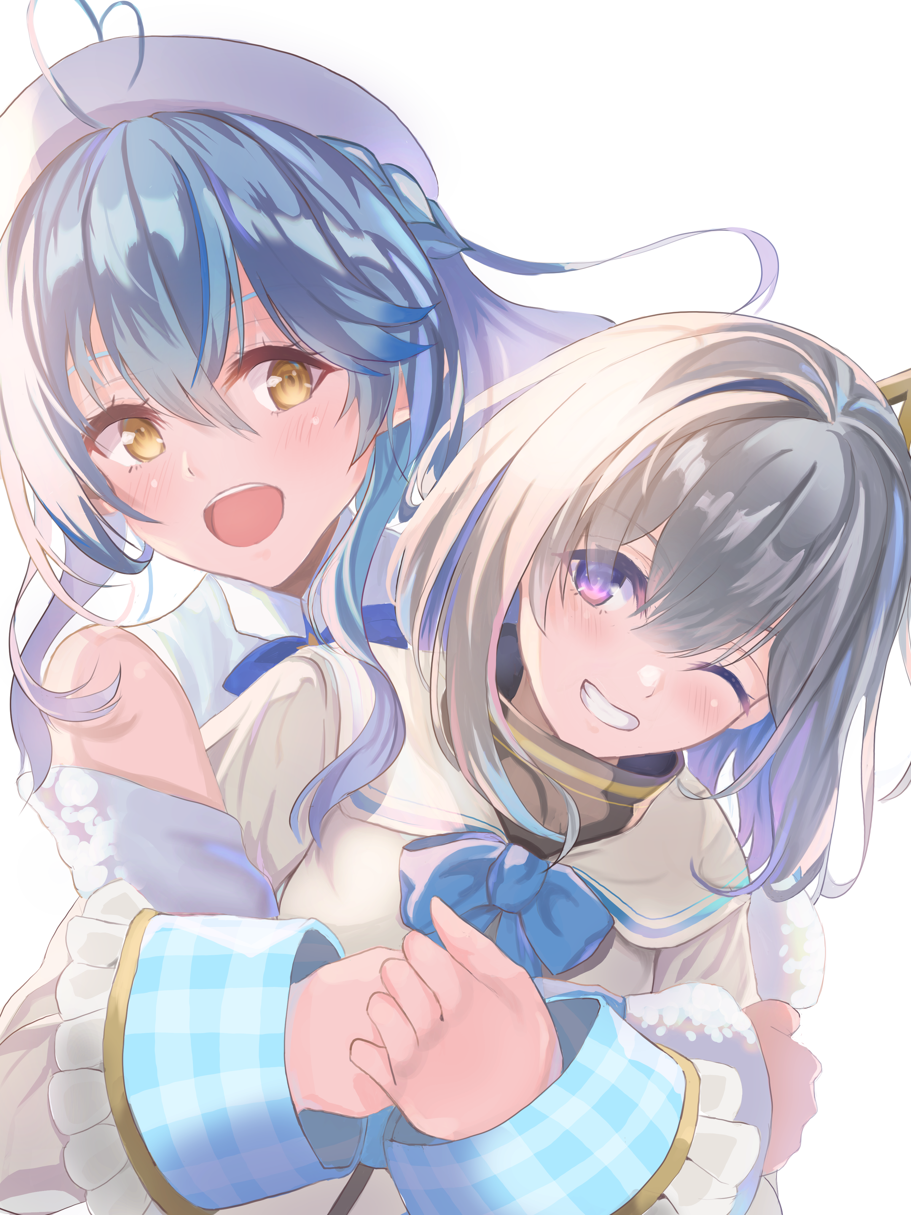 2girlsahogeberetblue bowblue hairblushbowelfgrey hairhair between eyeshatheartheart ahogehughug from behindjacketlong hairlong sleeveslooking at anothermultiple girlsone eye closedopen mouthpointy earssimple backgroundsmileteethtilted haloupper bodyvirtual youtuberwhite backgroundwhite hatwhite jacketyellow eyes