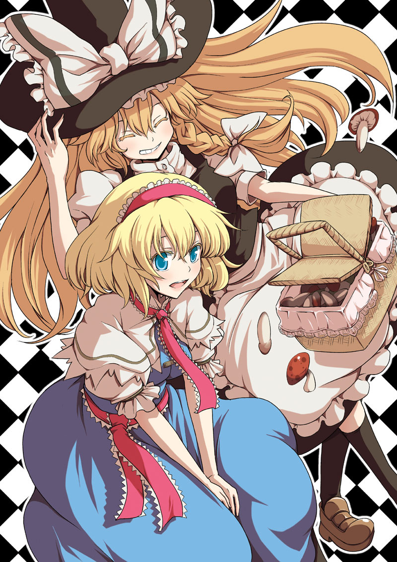 2girlsblonde hairblue eyesbowbraidbrown hairclosed eyesdressfemale focusfrillsgrinhair bowhairbandhatkneehighsloafersmultiple girlsmushroomnecktieopen mouthpicnic basketshoessittingsmilesocksv armswitchwitch hat