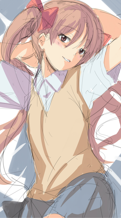 00s1girlarms behind headarms upbrown eyesbrown hairfemale focuslong hairlyingschool uniformsketchskirtsmilesolosweater vesttwintails