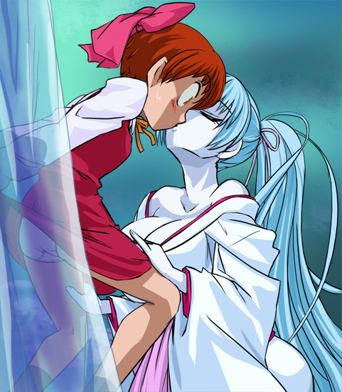 2girlsage differenceassbdsmblue hairblue skinblushbondageboundbowbreastsbrown haircleavageclothes liftcolored skindressdress liftfemale focusicejapanese clotheskisslarge breastslolilong hairmultiple girlsofficial styleonee-lolipantiespantyshotpink bowponytailshort hairsurprisedtrappedunderwearupskirtwhite pantiesyellow eyesyuki onnayuri