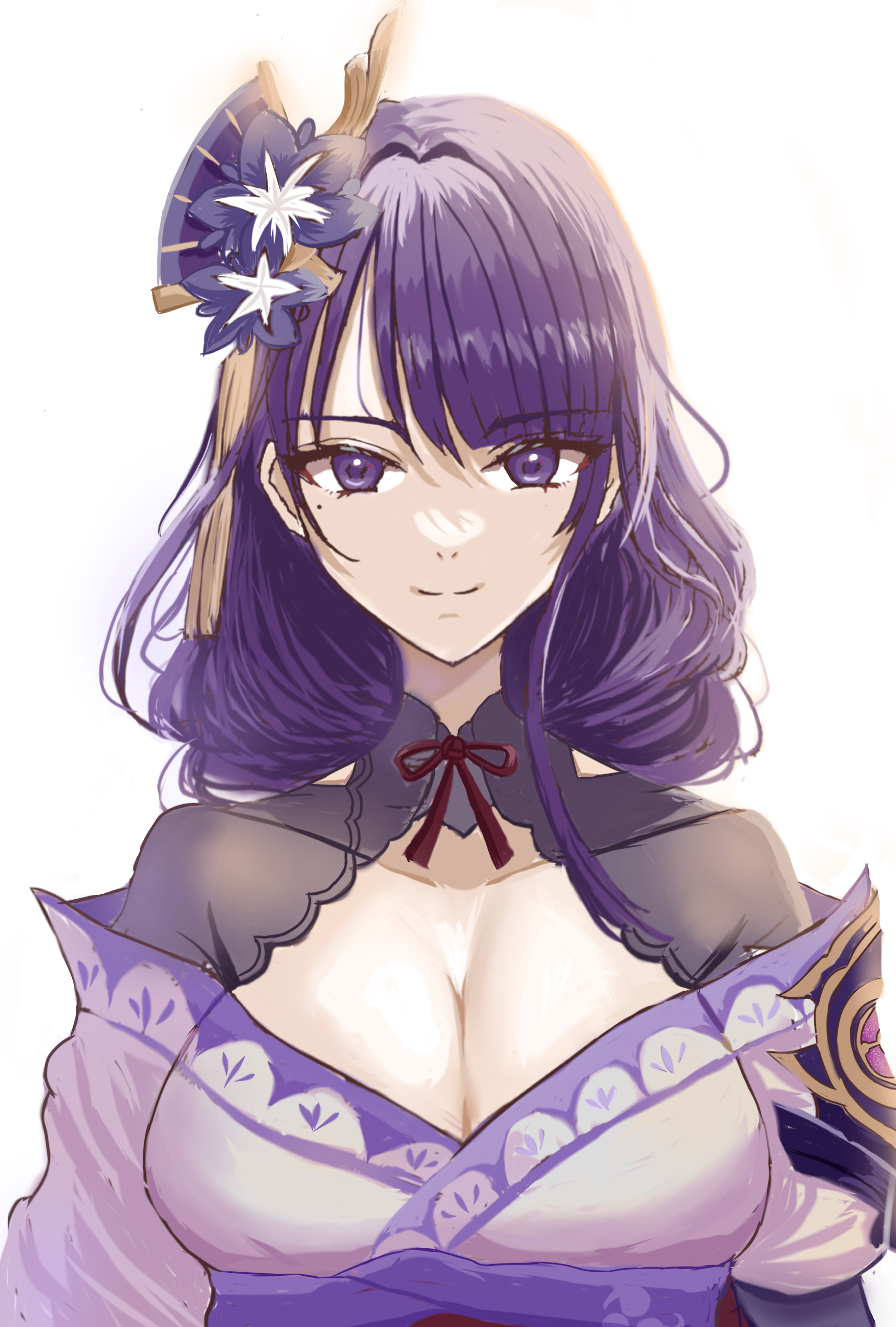 1girlakino hideshiarmorasymmetrical sleevesblunt bangsbreastsbridal gauntletscleavageclosed mouthclothing cutoutcollarbonefan hair ornamentflower ornamenthair ornamenthuge breastsjapanese clotheskimonolight smilelooking at viewermitsudomoe (shape)molemole under eyeneck ribbonoff shoulderpurple eyespurple hairpurple kimonopurple sashred ribbonribbonsashshadeshoulder armorshoulder cutoutsimple backgroundsolostandingtomoe (symbol)upper bodywhite backgroundwide sleeves