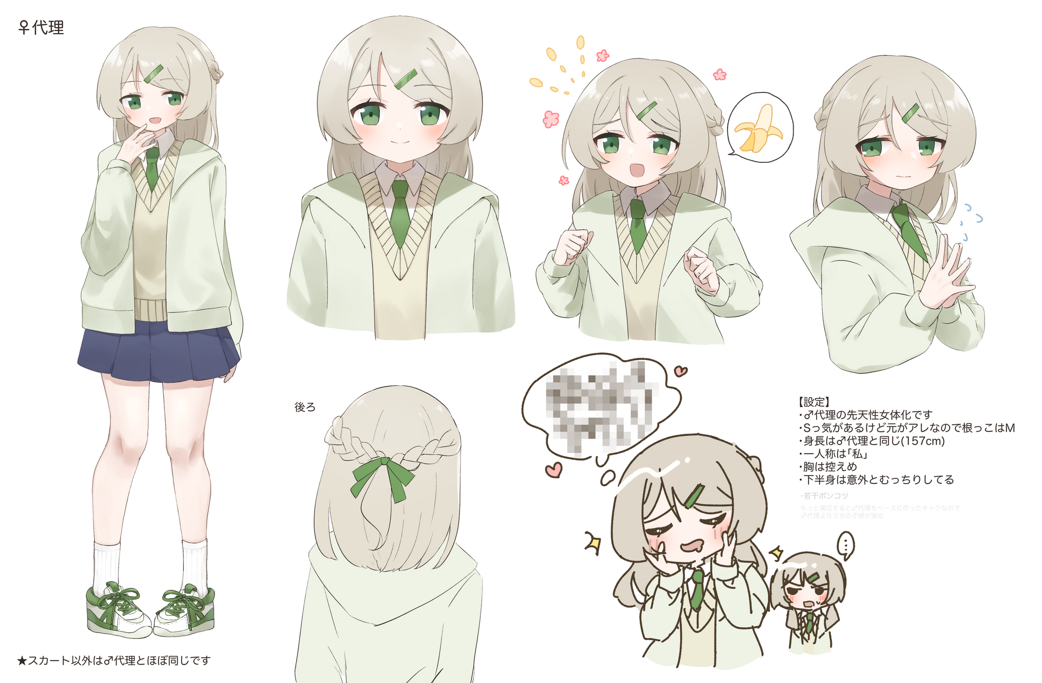 1boy1girlbananablonde hairbraidcensoredcrown braiddroolingflying sweatdropsfoodfruitgreen eyesgreen hoodiegreen shoeshair ornamenthair ribbonhaircliphands on own cheekshands on own facehearthoodhoodieminiskirtmosaic censoringpleated skirtreference sheetribbonshoesskirtsneakerssocksspoken heartspoken objectsteepled fingerstrapwhite socks