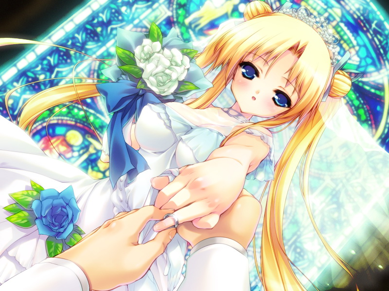 1girlblonde hairblue eyesblushbouquetbridal veilbridechurchdouble bundressdutch angleflowerhair ribbonjewelrylong hairopen mouthpovribbonringrosesolo focusstained glasstiaratwintailsveilvery long hairweddingwedding dress