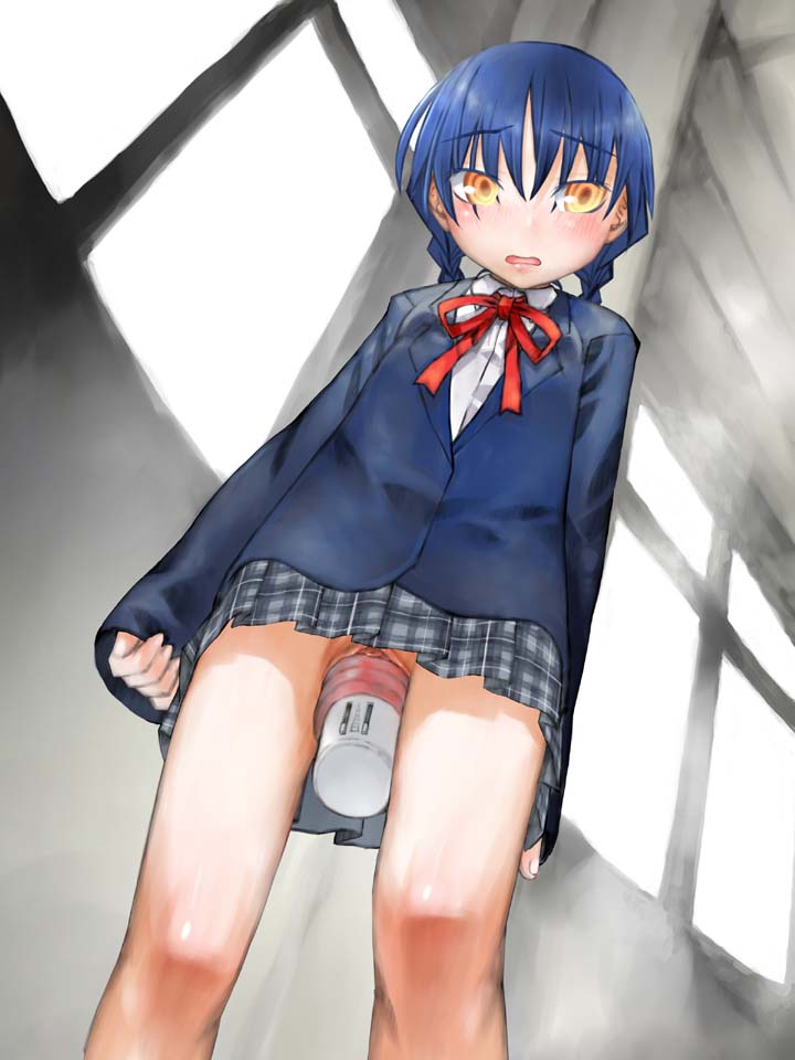 1girlblazerblue hairblushbraiddildofemale focusjacketlarge insertionno pantiesobject insertionpussyschool uniformsex toyshort hairsolostandingupskirtvaginalvaginal object insertionyellow eyes