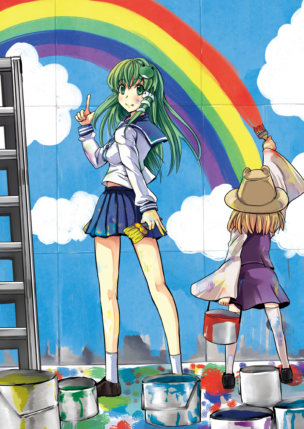 :p2girlsalternate costumeblonde hairfemale focusfroggreen eyesgreen hairhair ornamenthatmultiple girlspaint canpaintbrushpainting (action)rainbowschool uniformserafukusnakethighhighstonguetongue out