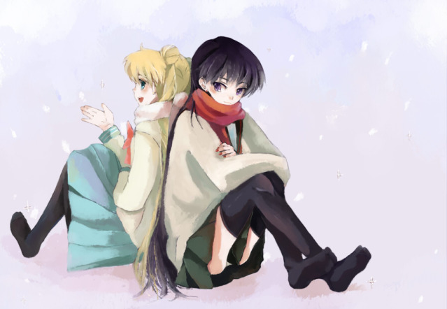 1990s (style)2girlsback-to-backblack hairblonde haircoldlong hairmultiple girlspantyhosesnowthighhighstwintails