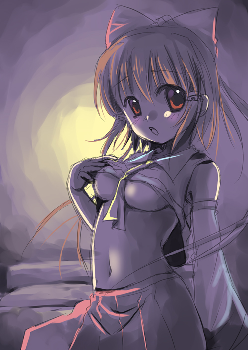 1girlbreastsbrown hairclothes liftfemale focushand on own chestmuted colornavelred eyesribbonshirt liftsketchsolounderboob