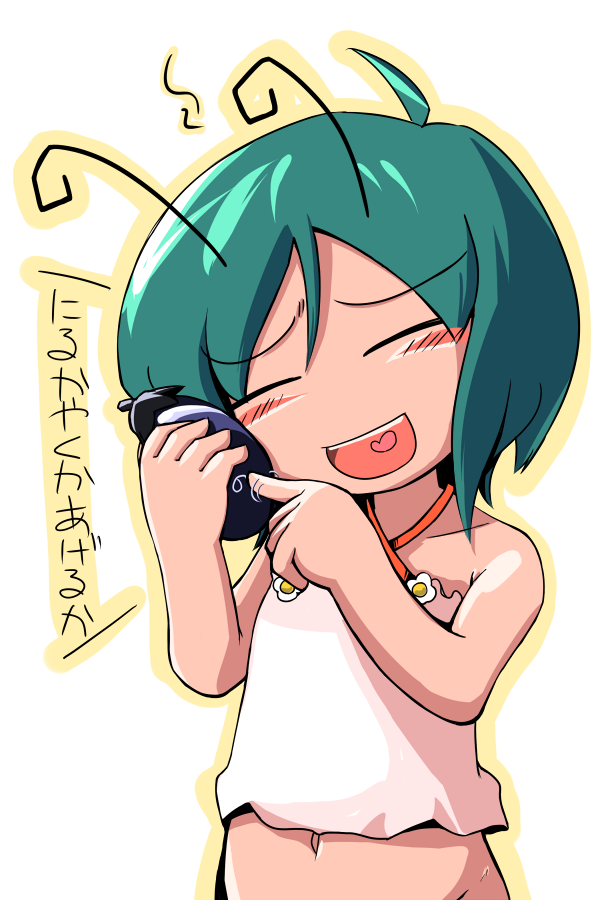 1girlahogeantennaeeggplantfemale focusgreen hairhead tiltheartheart in mouthnavelshort hairsolowhite background