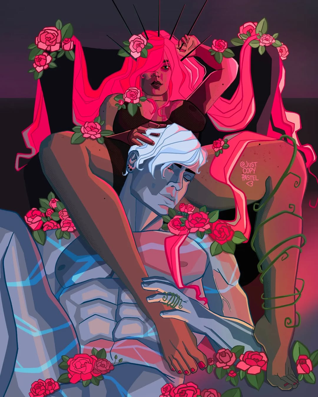 blue bodyblue skincrownFlag for Deletionhades (lore olympus)married couplemuscularpersephone (lore olympus)pink bodypink hairpink skinshirtless malesplayed legssports brawhite hair