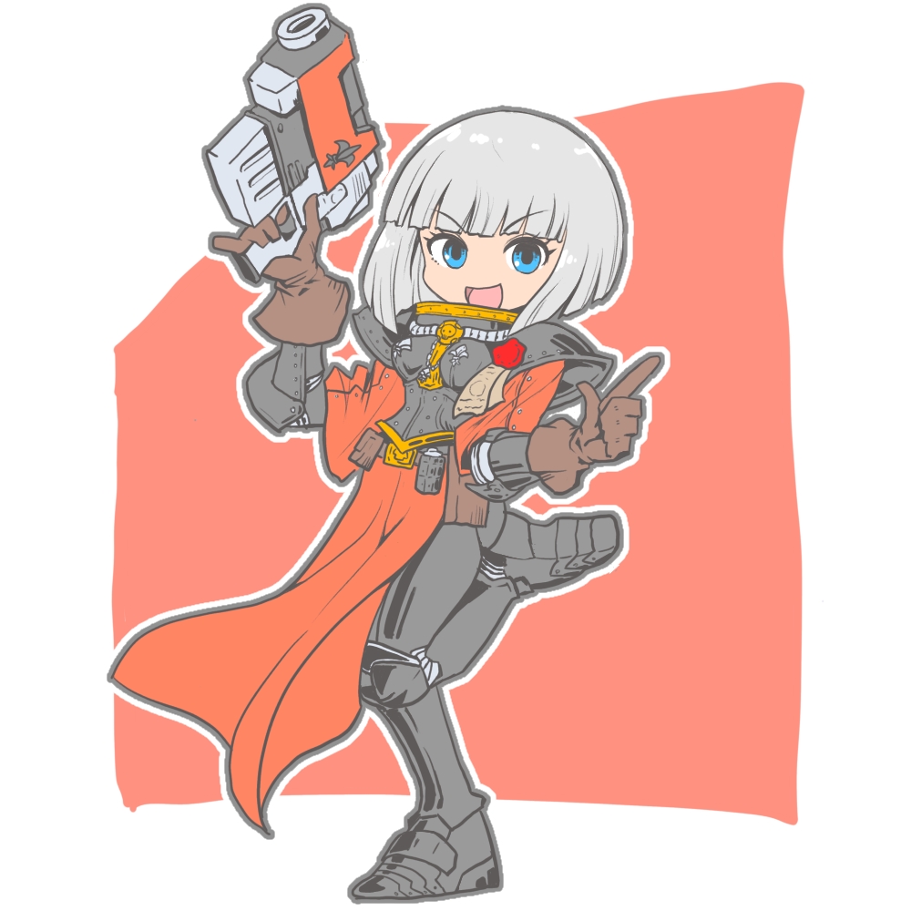 1girlarmorblue eyesbolterbreastsbrown glovesexplosivefleur-de-lisglovesgrenadegunholdingholding bolterholding weaponlooking at vieweropen mouthpauldronspointingpower armorpurity sealshort hairshoulder armorsimple backgroundskullsoloweaponwhite hair