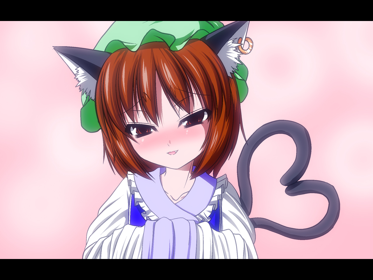 1girlanimal earsblushcat earscat girlcat tailcosplayearringsfangfemale focusgradient backgroundheartheart tailjewelrymultiple tailssolotailyakumo ran (cosplay)