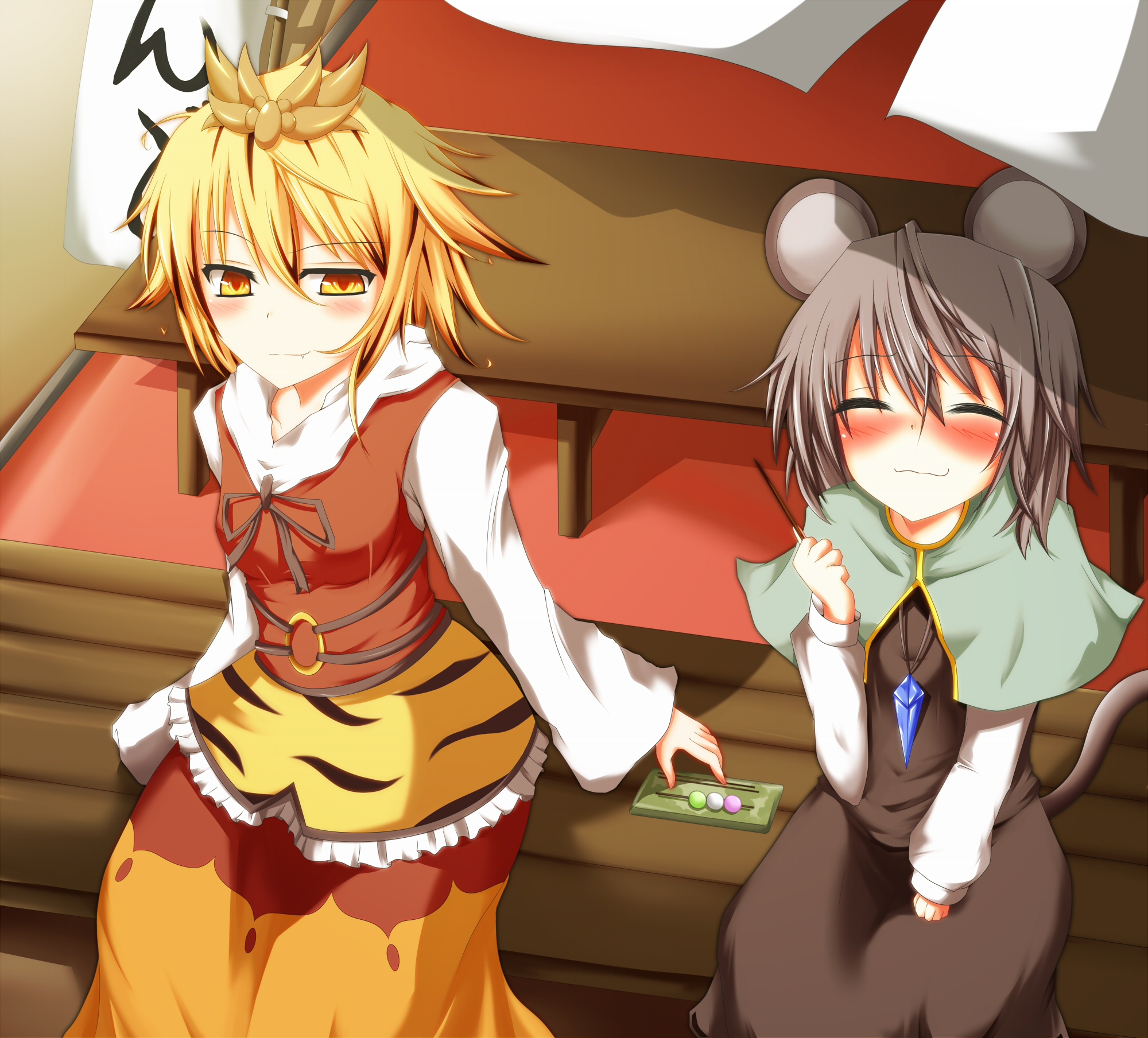 2girlsanimal earsanimal printblushdangoeatingfangfemale focusfoodfrom abovemouse earsmouse tailmultiple girlssanshoku dangosittingskewertailtiger printwagashi