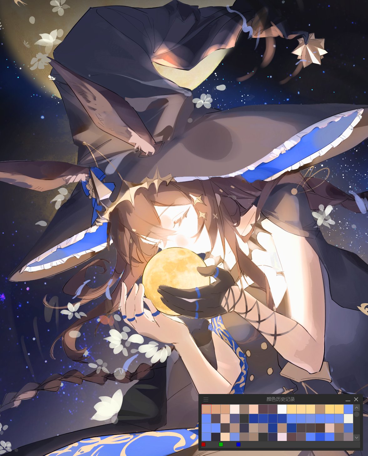 1girlanimal earsart program in frameblack dressblack glovesblack hairblack jacketbraidbreastsclosed eyescolor guidedressears through headwearflowergloveshatholding moonjacketjacket on shouldersjewelrymultiple ringsringsingle braidsingle gloveskysolostar (sky)starry skywhite flowerwitch hat