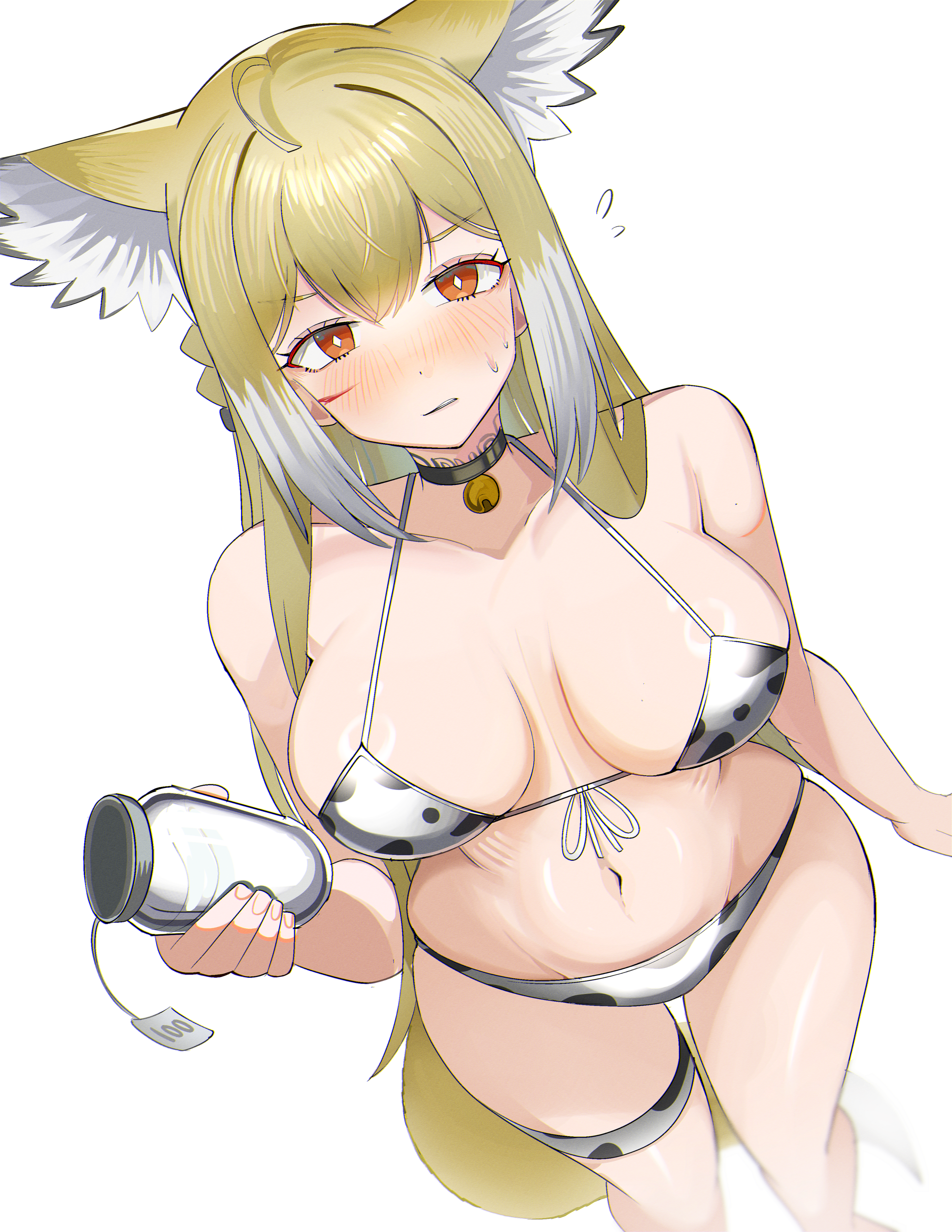 1girlanimal earsanimal printbare armsbare shouldersbellbikiniblack chokerblonde hairblushbottlechokercollarbonecow printdutch angleflying sweatdropsfox earsfox girlfox tailfront-tie bikini topfront-tie tophair between eyesholdingholding bottlejingle belllong hairlooking at viewernavelneck bellnose blushprint bikinired eyessimple backgroundsolostandingsweatswimsuittailvery long hairwhite background