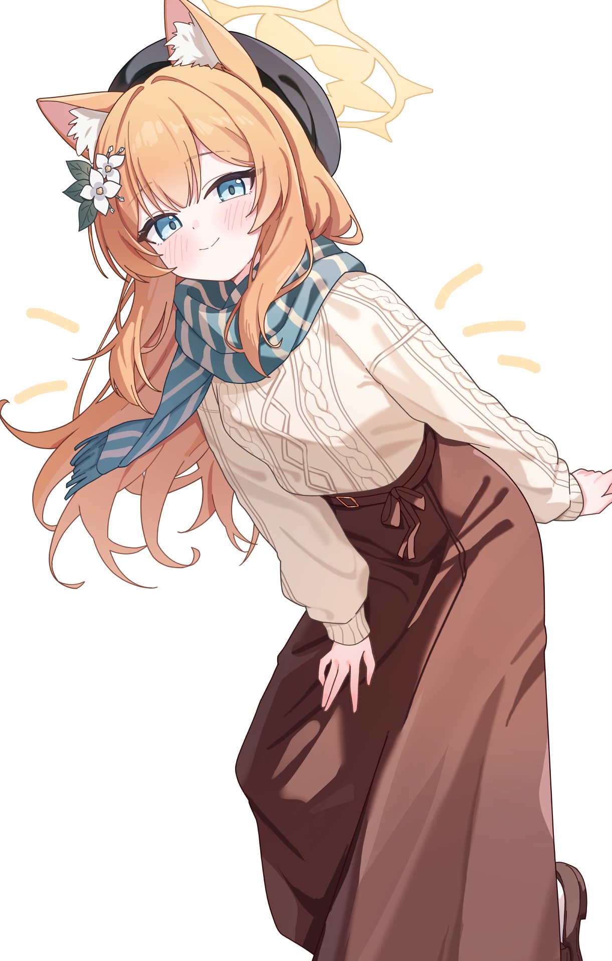 1girlanimal earsberetblue eyesblushcat earscat girlflowerhair flowerhair ornamenthalohatlong hairlong skirtorange hairorange haloribbed sweaterscarfsimple backgroundskirtsmilesolosweaterwhite background