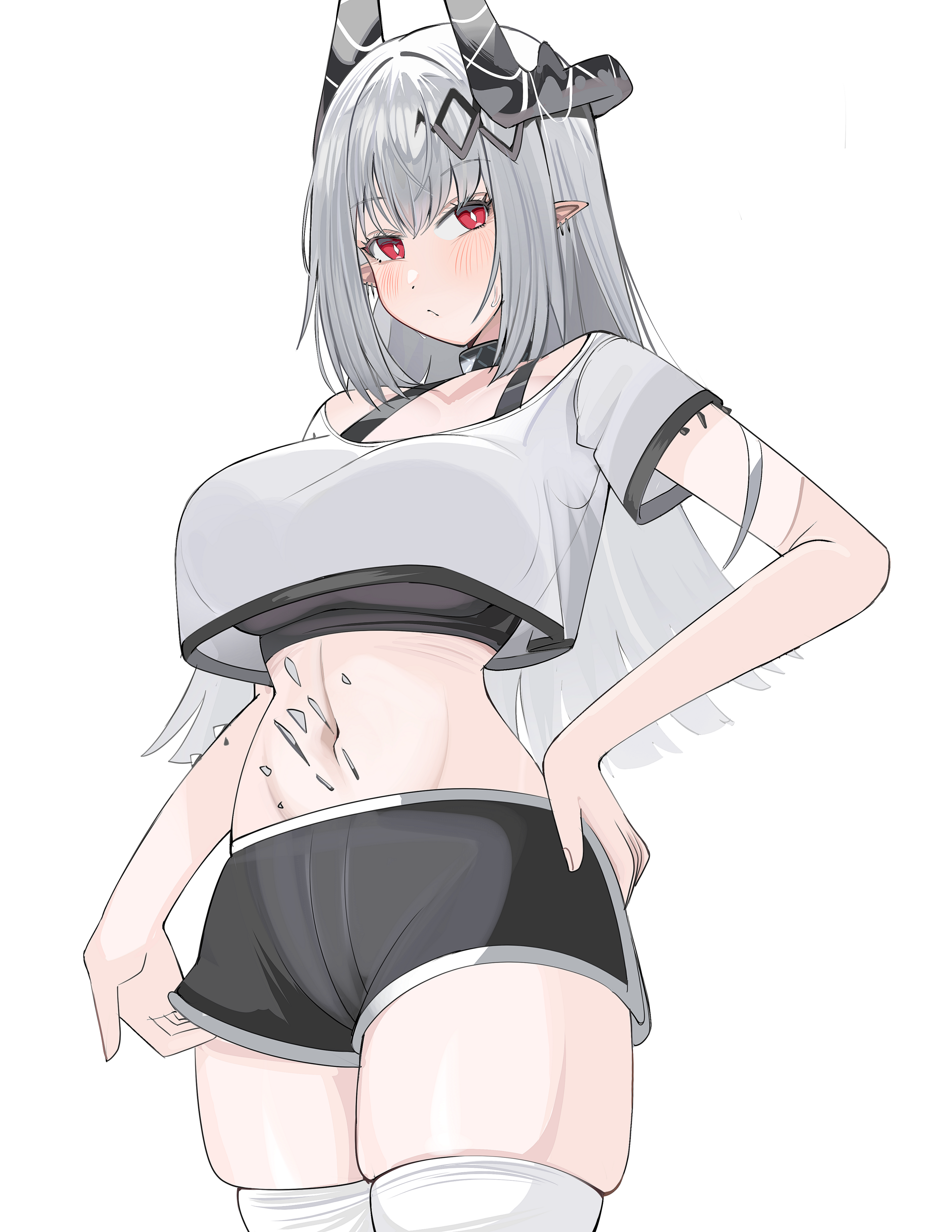 1girlalternate costumeblack brablack hornsblack shirtblushbrabreastsbright pupilsclosed mouthcollarcowboy shotcropped shirtdolphin shortsear piercinghair ornamenthand on own hiphornslarge breastslong hairlooking at viewermaterial growthnaveloripathy lesion (arknights)piercingpointy earsred eyesshirtshort sleevesshortssimple backgroundskindentationsolosports brastandingstomachthick thighsthighhighsthighsunderwearwhite backgroundwhite hairwhite pupilswhite shirtwhite thighhighs