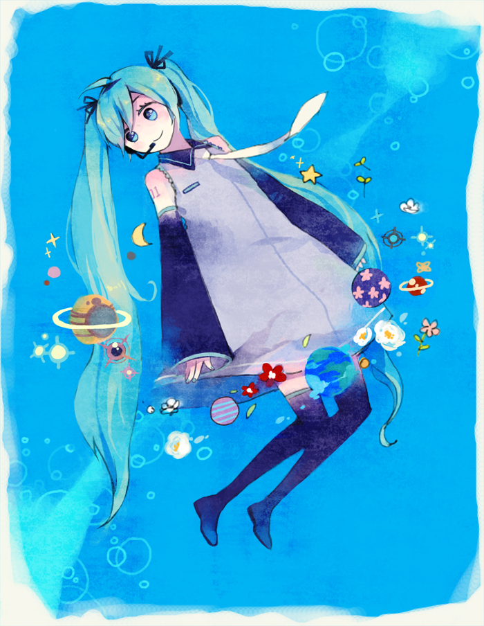1girlaqua eyesaqua hairdetached sleevesfemale focusflowerfull bodyheadphonesheadsetleaflong hairnecktiepetalsplanetsmilesolostar (symbol)thighhighstwintailsvery long hair