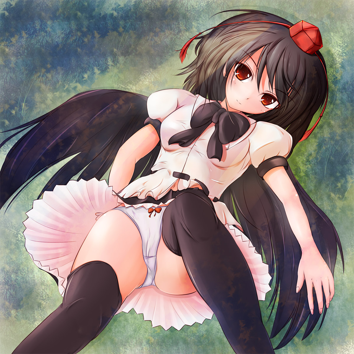 1girlblack hairblack wingsfemale focushatlooking at viewerpantiesred eyesshort hairskirtsolothighhighstokin hatunderwearwings