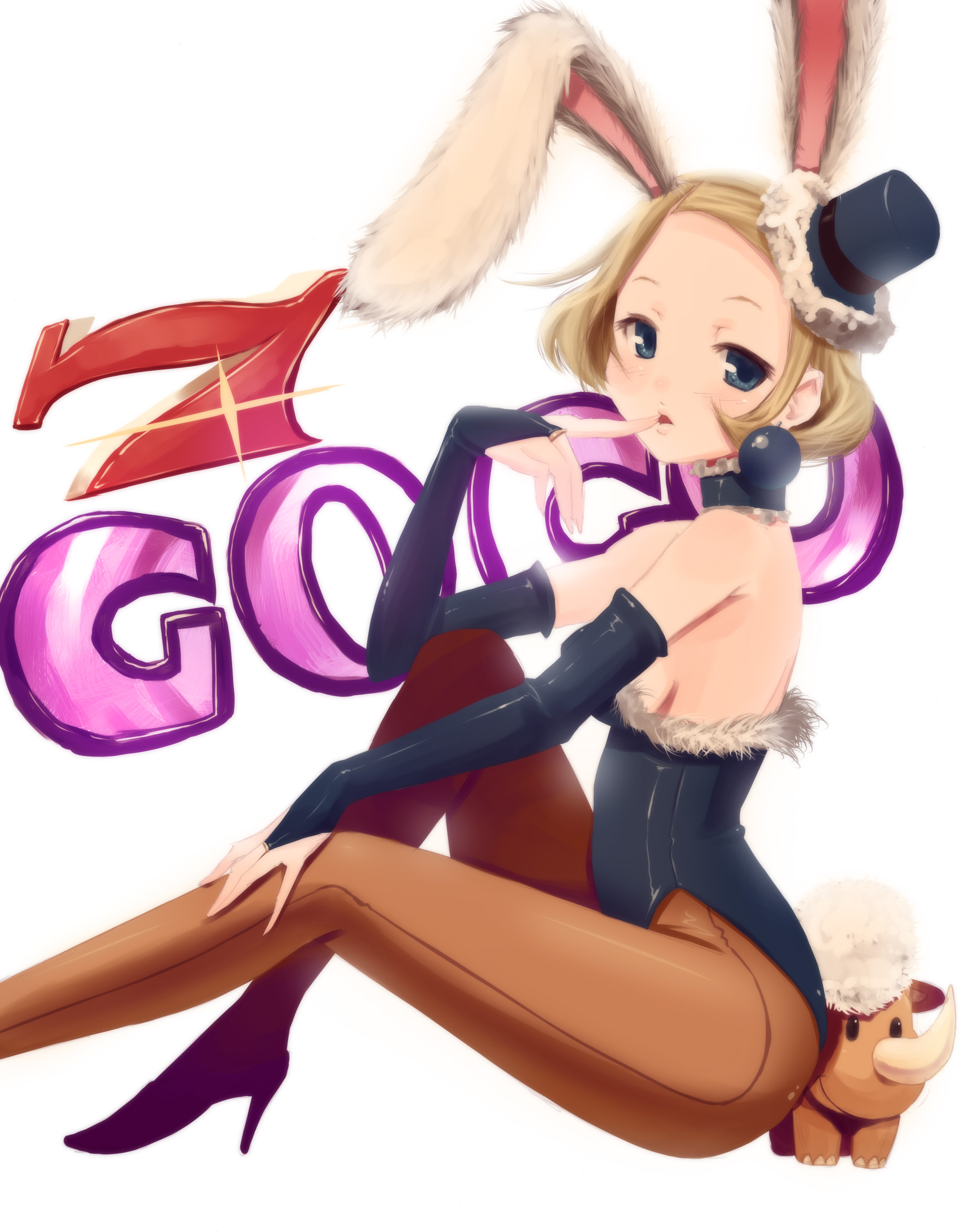 1girlanimal earsbridal gauntletschokerfake animal earsfemale focusfinger to mouthhathigh heelsmini hatmini top hatpantyhoseplayboy bunnyrabbit earsshoessolotop hat